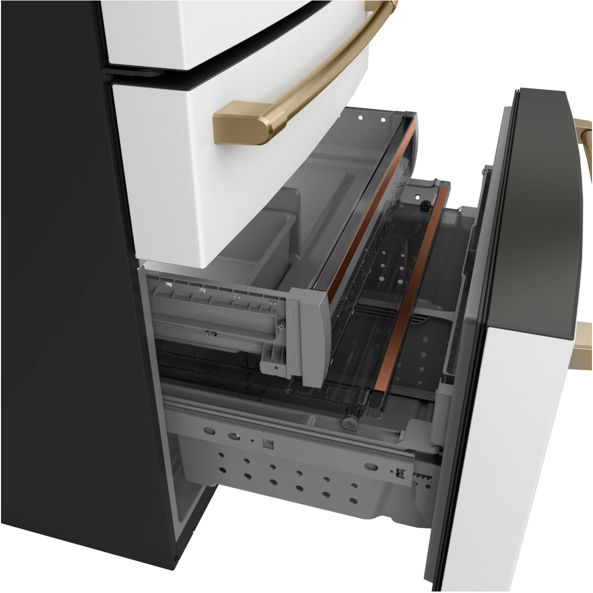 - This stylish refrigerator’s Convertible Drawer with Glass Dividers offers a clean, aesthetic storage solution that allows for simplified organization.