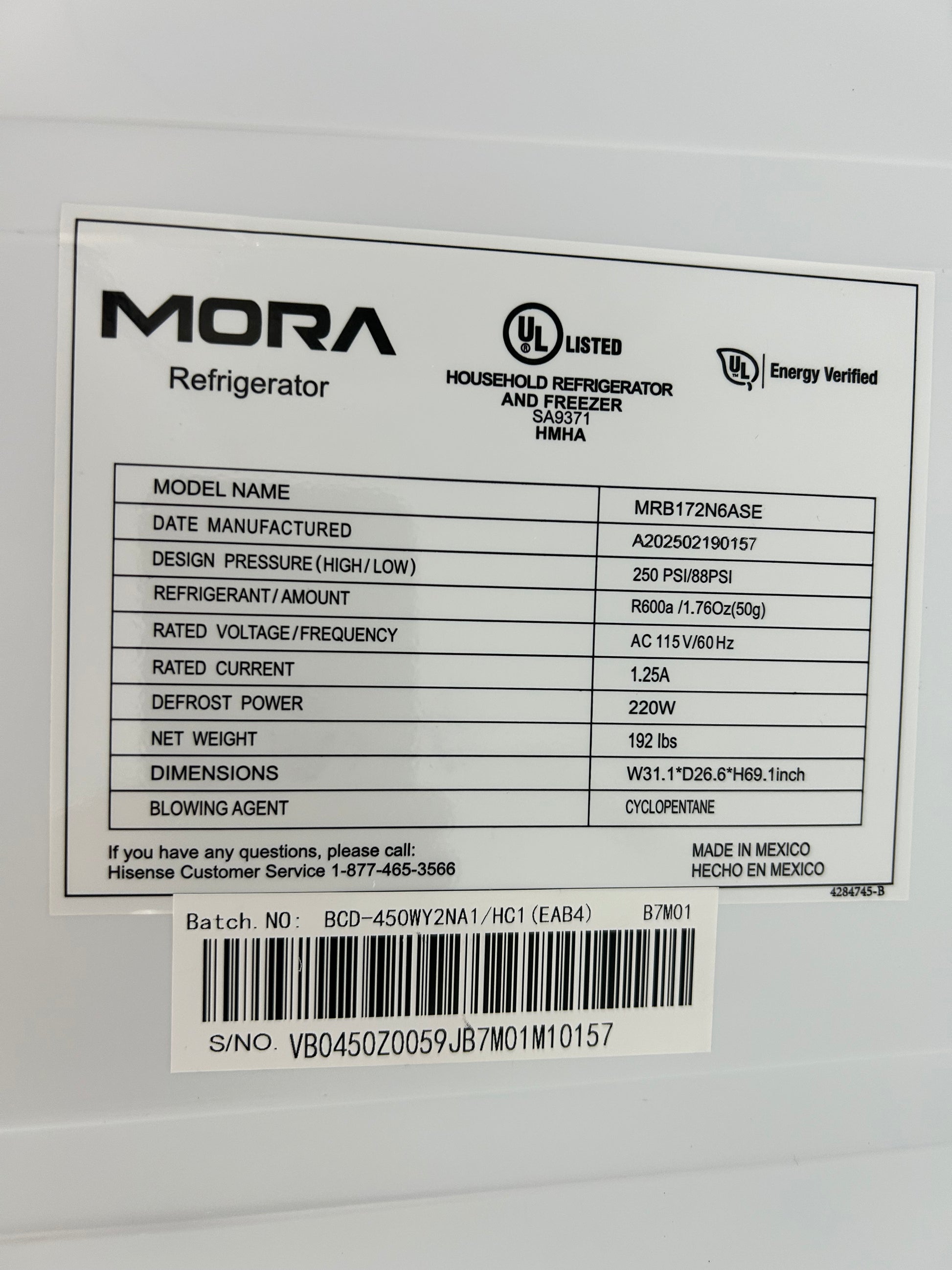Brand: MoraColor: Stainless SteelDimensions (WxDxH): 31.1 in. x 29.1 in. x 69.1 in.Door Installation: ReversibleFeatures: Energy Star CertifiedFeatures: Fingerprint ResistantFit Width: 31 - 33 Inch WideFreezer Capacity: 5.1 cu. ft.Model: MRB172N6ASEOverall Capacity: 16 - 17.9 cu. ft.Refrigerator Capacity: 12.1 cu. ft.Refrigerator Features: Adjustable ShelvesRefrigerator Features: Interior LED LightingRefrigerator Installation Depth: Counter DepthRefrigerator Type: Bottom FreezerWeight: 196 lb.